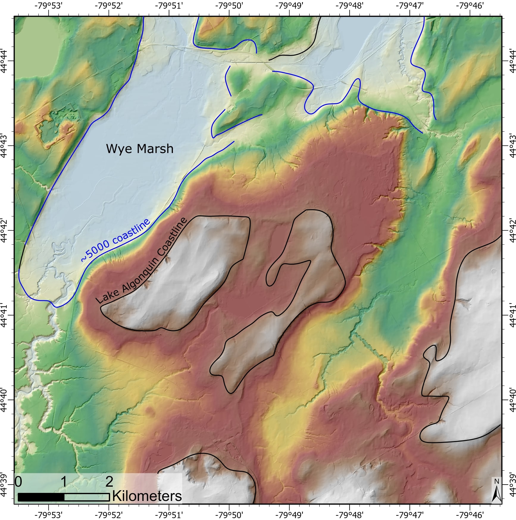 In ‘Huronia’ – the region roughly between the Nottawasaga and Severn Rivers – we worked with Jamie Hunter to explore the ancestral home of the Wendat. One tool at our disposal is called ‘LiDAR’ which uses pulses of light to collect very high resolution elevation data. The geomorphology of Huronia today consists of plateaus separated by valleys. Many of these plateaus were once islands in a vast glacial lake that formed about 11,000 years ago against the margin of the last ice sheet. As the waters receded (and later rose and fell again) it left behind fossilized shorefaces and bluffs, much like the rings in a bathtub, which can be visualized with LiDAR.